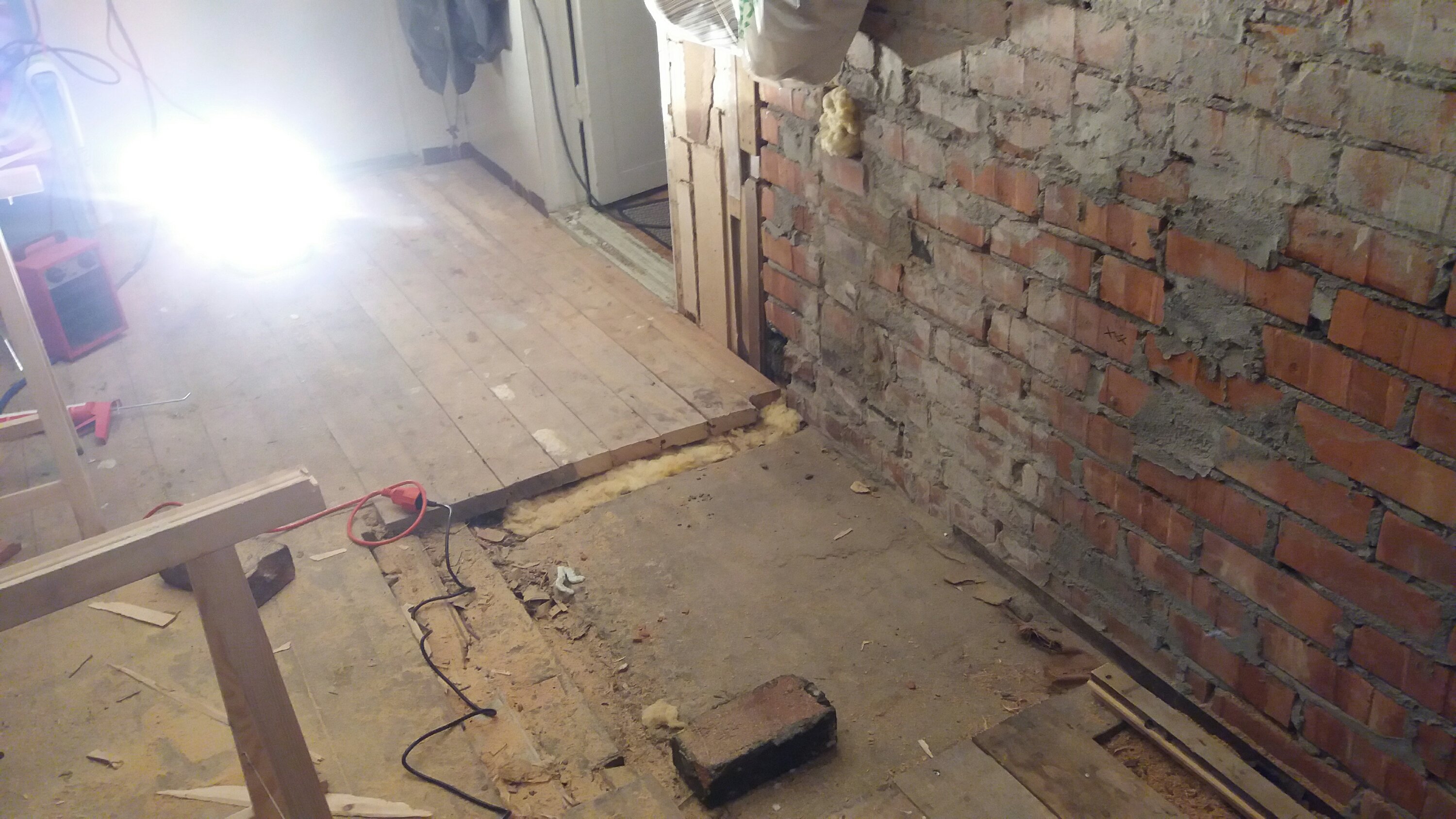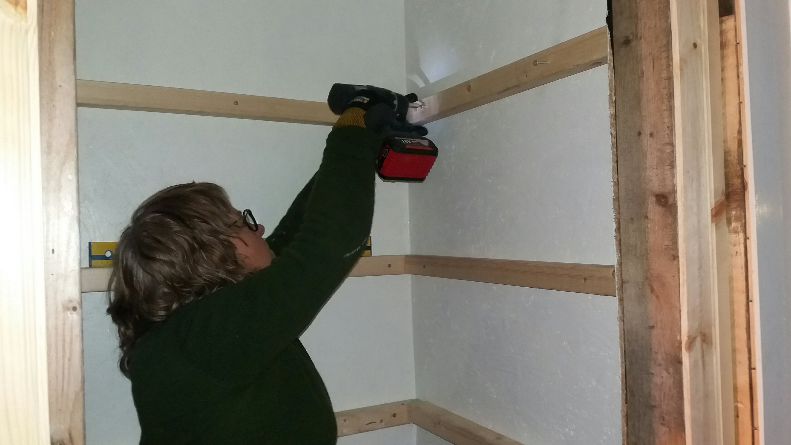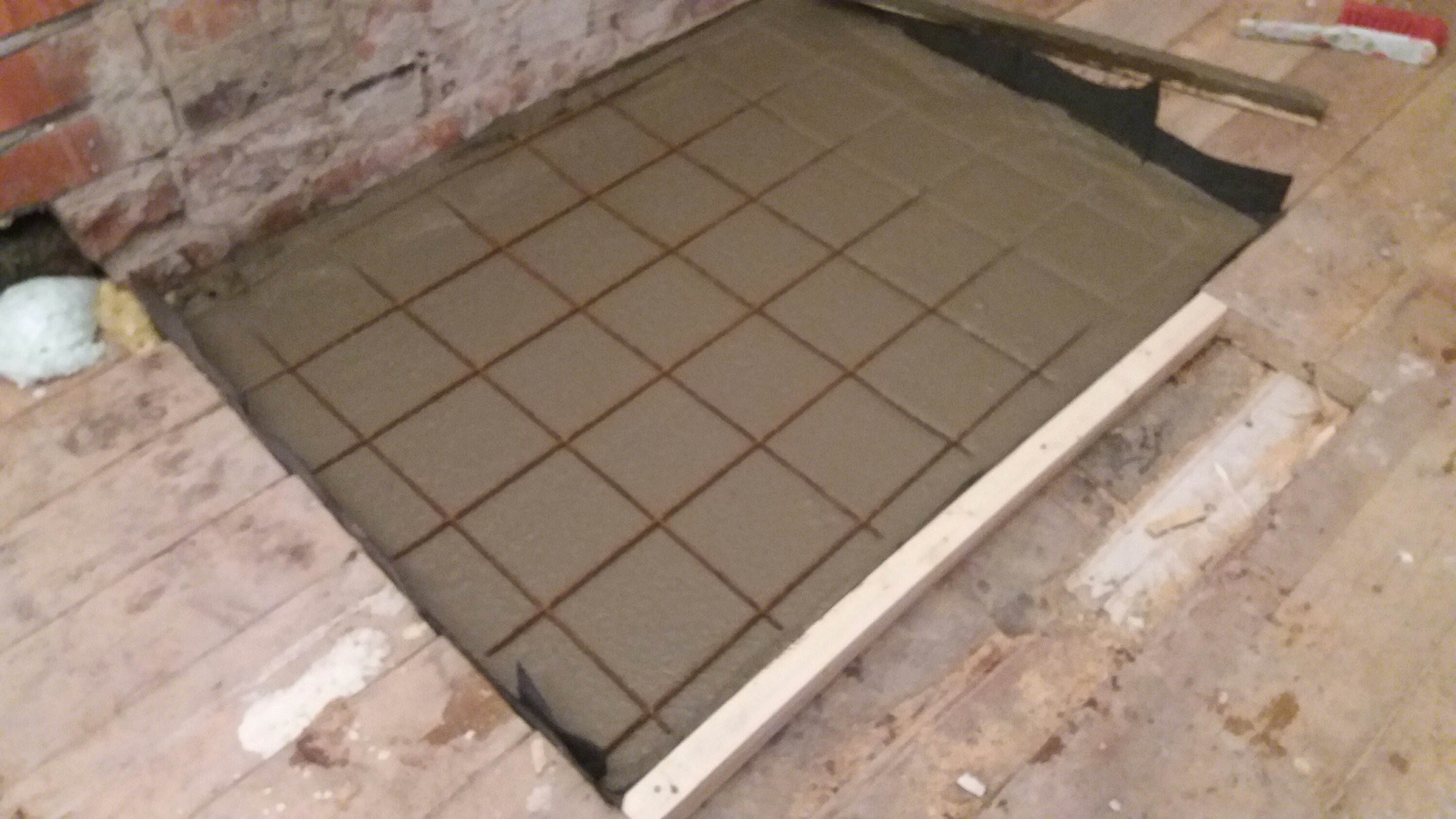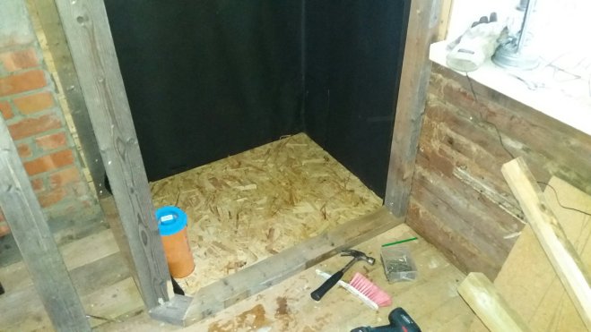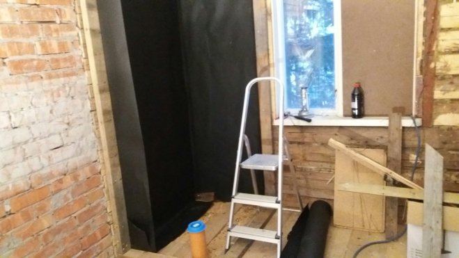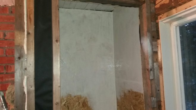 Helgen som var började Matz med att mura i köket, det som vedspisen ska stå på. En första gång för honom men något som jag tycker att han fick till väldigt bra ändå. Själv limmade jag fast några laminatskivor på golvet i det blivande kylskåpet. Skivorna som också ingick i fyndpaketet från Tradera blir toppen som golv, lätta att torka av och hållbara. Sen satte jag reglar för hyllorna, där gällde det att räkna ut hur vi vill ha det och hur stort mellanrum det behöver vara. Själva hyllorna gör vi av några skivor mdf som vi hade kvar efter en bokhylla vi byggde till lägenheten. De är kanske inte det optimala eftersom det är lite svikt på dem, men de får duga så länge. Det vi också hann med var att limma ihop det som ska bli kylskåpsdörr.