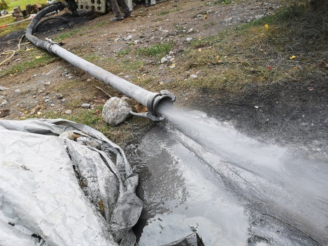 Till slut strilar det egna vattnet ut från slangen.