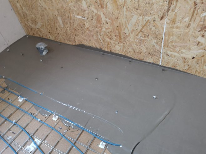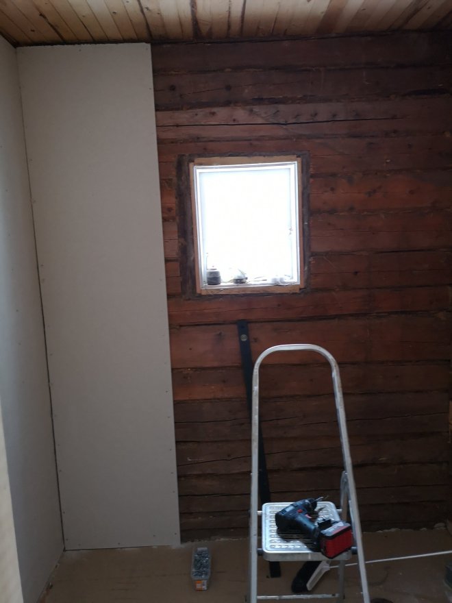 Gipsskiva för våtrum sattes in. Golv förstärktes och golvvärme las in.