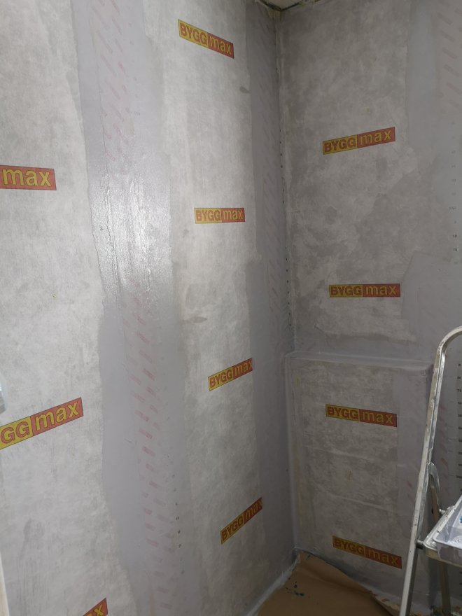 Tätskikt förs på (superviktigt) i duschen. Sen kommer det roligaste – vi ses när kakel och väggar ska kläs in.