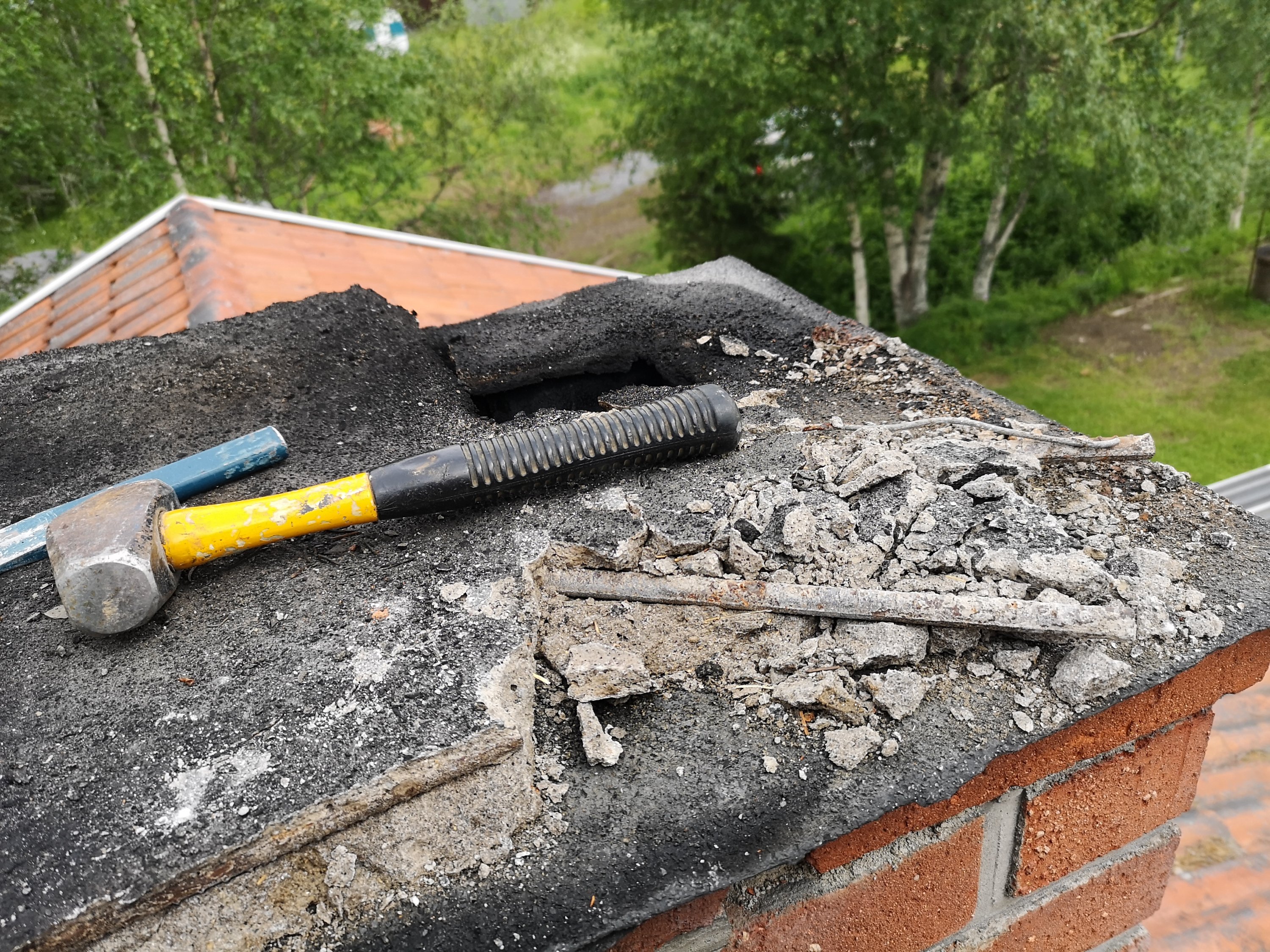 Med slägga och huggmejsel var det bara att gå på. Kronan överst på skorstenen bjöd på lite motstånd, men med envishet och styrka gick den att få bukt med.