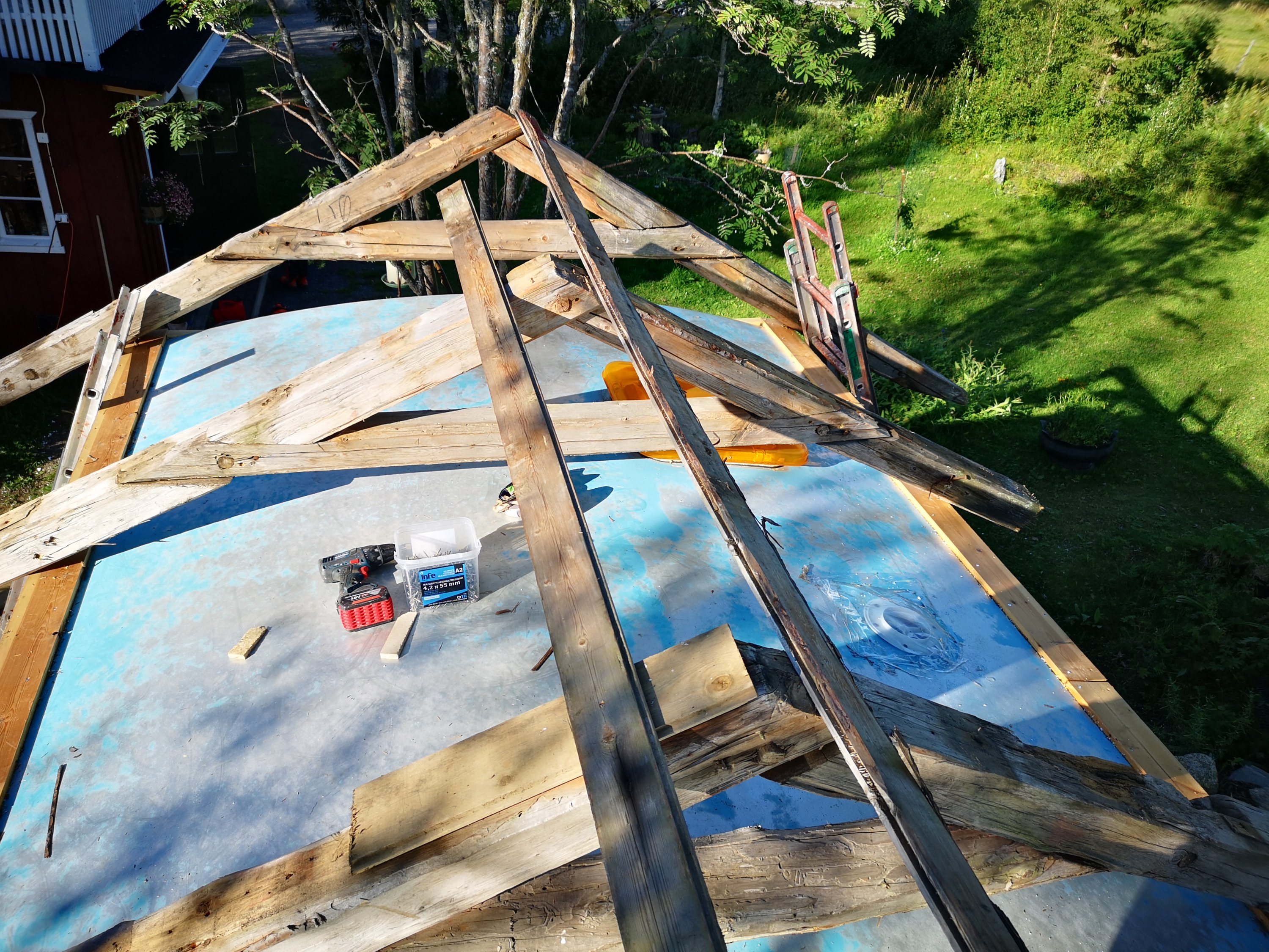 Teglet som kunde räddas från taket hamnade på vårt eget tak och nu sökte sig våra hungriga blickar mot takstolarna som inte såg alltför hemska ut. Skulle vi kunna använda dem. Kanske på….