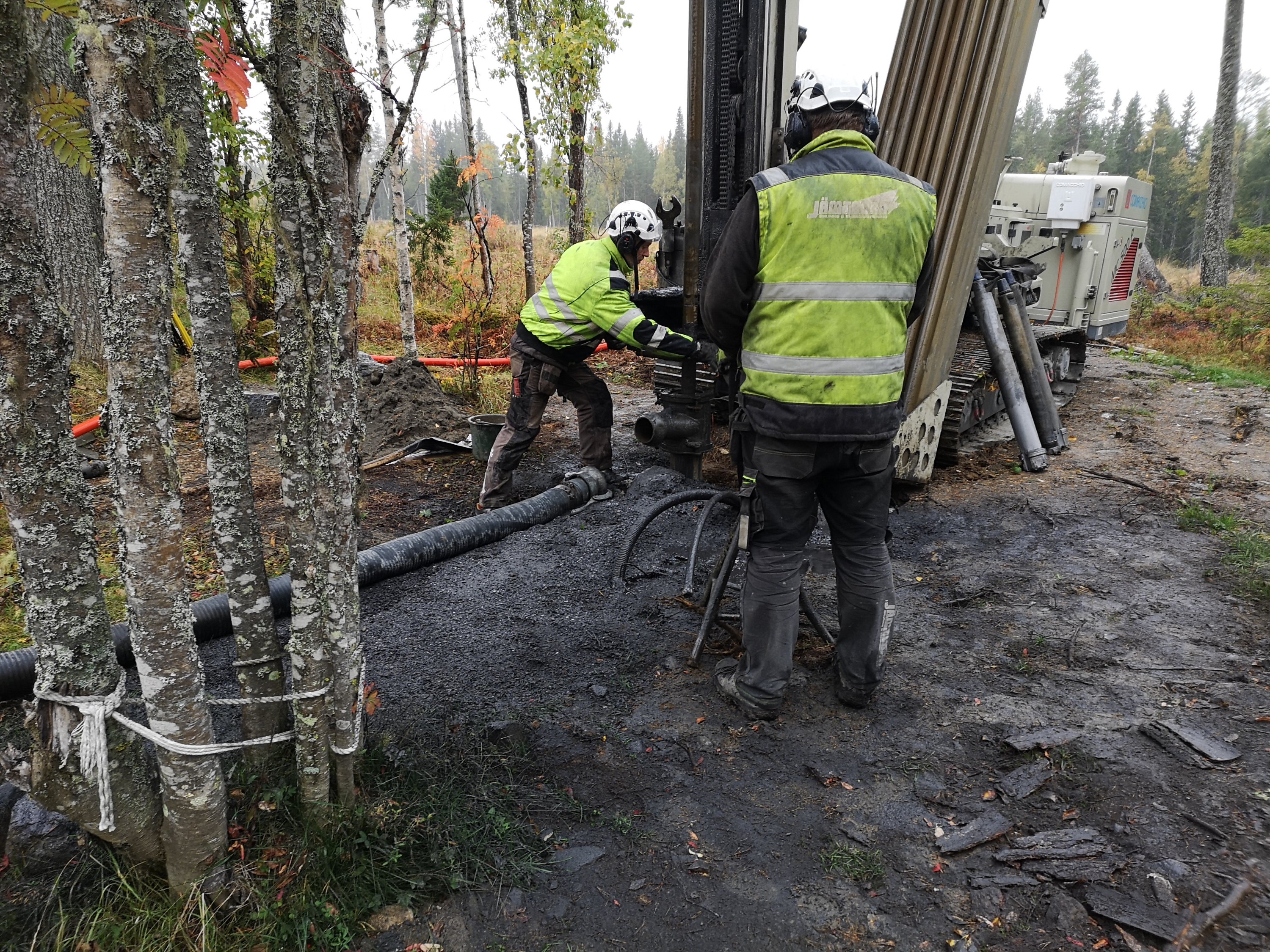 Redan efter ca 2 meter stöter vi på berget. Blir glad eftersom det trots allt är en ekonomisk fråga också det blir dyrare ju längre ner innan berget man måste borra. Här kan man verkligen konstatera att berget består av skiffer. Ett svart pulver sprider ut sig över marken. När de frågar mig vart de kan spruta ut slaggen trodde jag inte att det skulle bli så mycket. Tänk vad man får lära sig