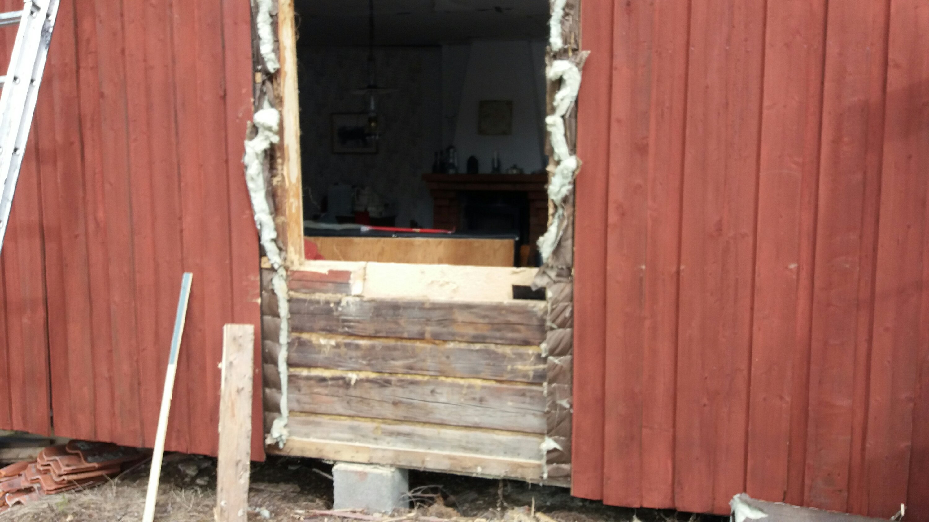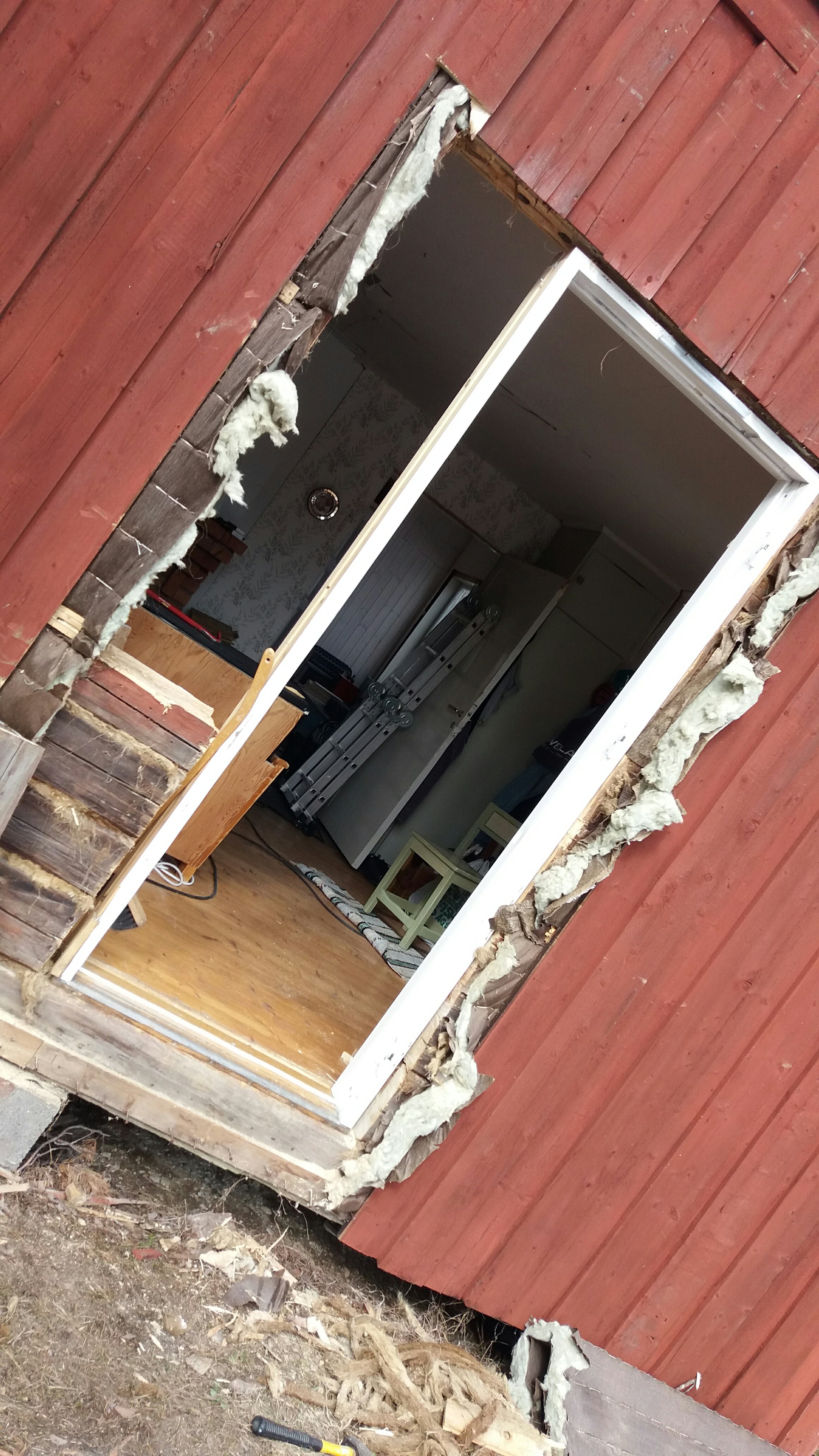 Men detta är ju berättelsen om fortsättningen av fönsteräventyret. Bredvid den fantastiska altandörren som vi satte in, öppnade vi upp för ett fönster till. Så jag slet fram motorsågen tog mått och började såga. Detta är det helt underbara med att ha ett timmerhus. Behöver du en öppning så fixar du den, lätt. Om man nu mäter rätt naturligtvis. När jag väl hade sågat klart och plockade upp karmen insåg jag att det är viktigt att inte bara veta måttet på det du ska såga utan även varifrån du mäter. Hålet blev lite för stort. Men det fixar vi.