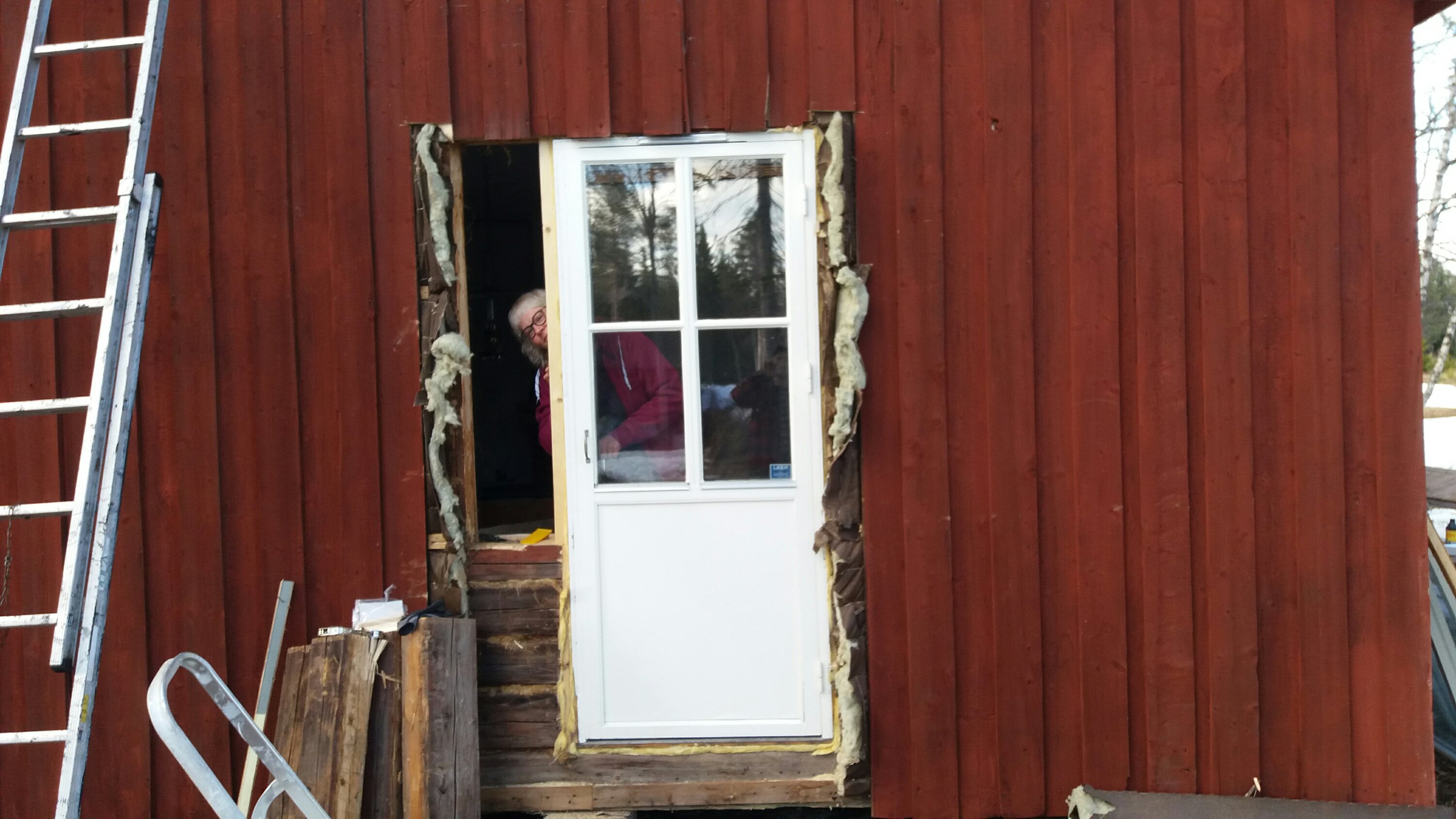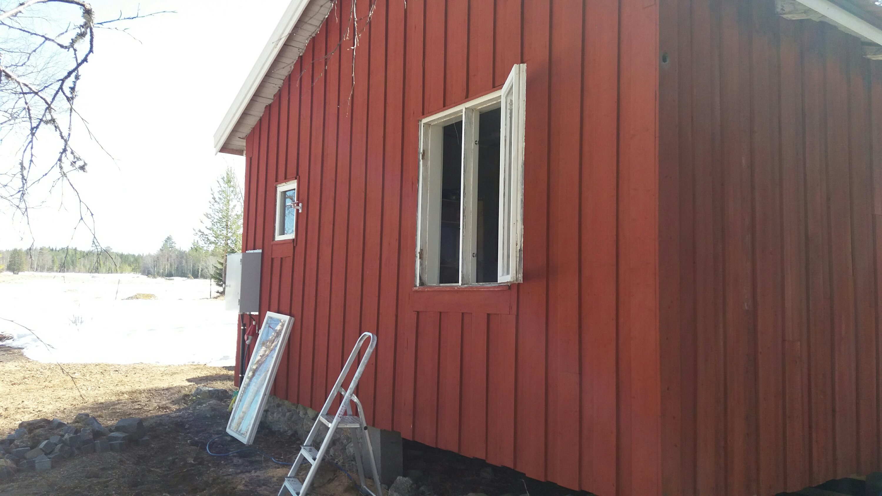 Vi hittade en gammal Falurödfärg som förra ägarna hade lämnat. Tyvärr hade den stått ute i kylan under vintern och frusit till. Bitte försökte måla med den med det var inte så lätt. Allting såg ut som en grynig välling och ungefär lika lätthanterlig. Så lite färsk färg nu på detta och sedan väntar vi på fönsterblecken så kan vi slutföra det hela.