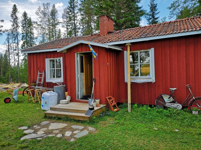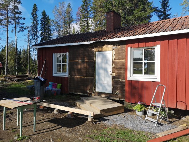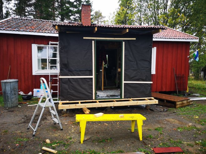 Den lilla farstun som fanns till stugan var liten och helt omöjlig att använda på ett vettigt sätt. När du väl öppnade ytterdörren (som gick inåt) gick det inte att öppna innerdörren eftersom de hela tiden gick in i varandra. Dessutom såg vi att kanten in mellan väggen och farstun var rena autostradan för diverse smådjur så detta behövdes verkligen åtgärdas. Vår tanke vara att tillföra huset en ordentlig farstu som satt i mitten samt kunde användas med tanke på kläder och skor.. Så vår plan var helt enkelt att riva och sedan bygga nytt.