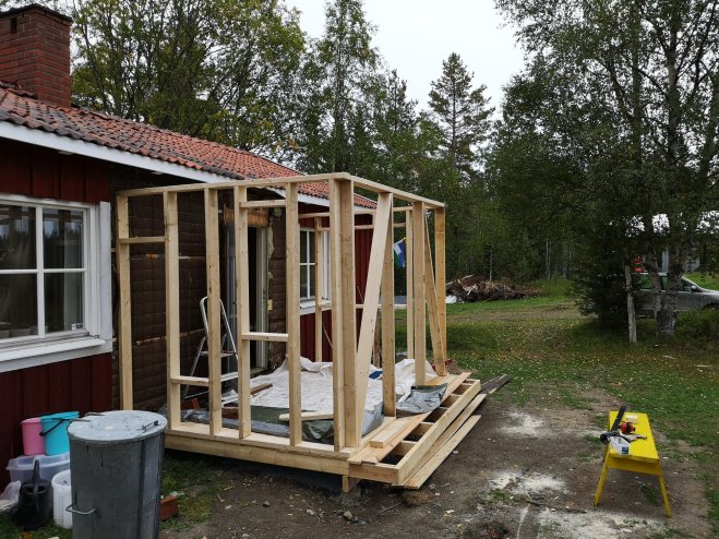 Eftersom vår plan är att höja huset ett halvt plan, så att vi kan göra ett sovloft på övervåningen så ville vi skapa en farstu som , när den dagen kommer typ nästa sommar, kommer att se bra ut den dagen. Så efter en del funderingar och mätningar beslöt vi vart bärlinan skulle ligga.