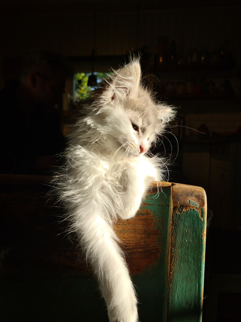 Det är inte svårt att hitta tillfällen att ta bild på lilleman, han är alltid med. När man lagar mat sitter han på axeln, när man putsar fönster tittar han på, och när man duschar ligger han på badrumsgolvet. Och keligare kisse har ingen av oss varit med om, han får aldrig nog.