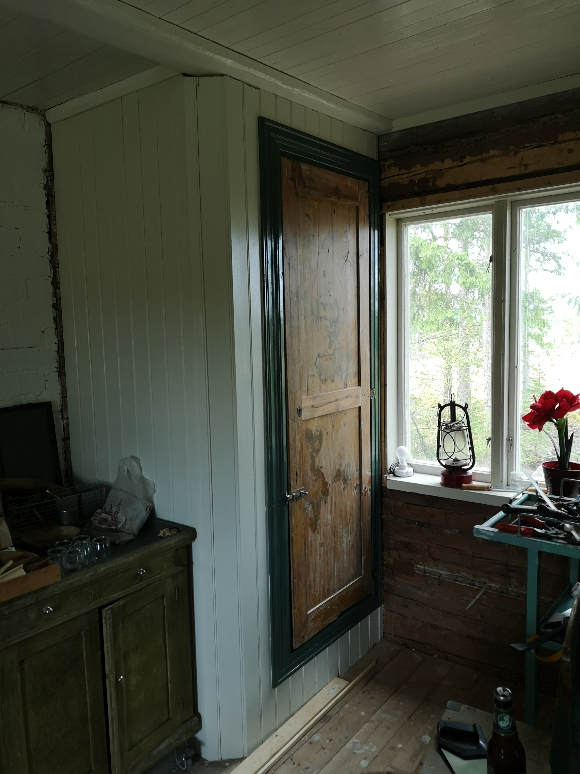 I år har vi byggt ett matrum på ödmjuka 40m2. Det hela startade med att vi tog rätt på ett gammalt bakbord, 110cm x 250cm, och som vi såg framför oss skulle bli ett fantastiskt matbord. Men var? Även om vi numera också har övervåning på stugan, som vi byggde 2018 mest på grund av att stugan behövde ett nytt tak, så fanns inte golvytan för att så stort bord. Drömmen var också att kunna sitta och titta ut över nejden (läs; hygge med vindfällor och ris och med lite älgar och rådjur).