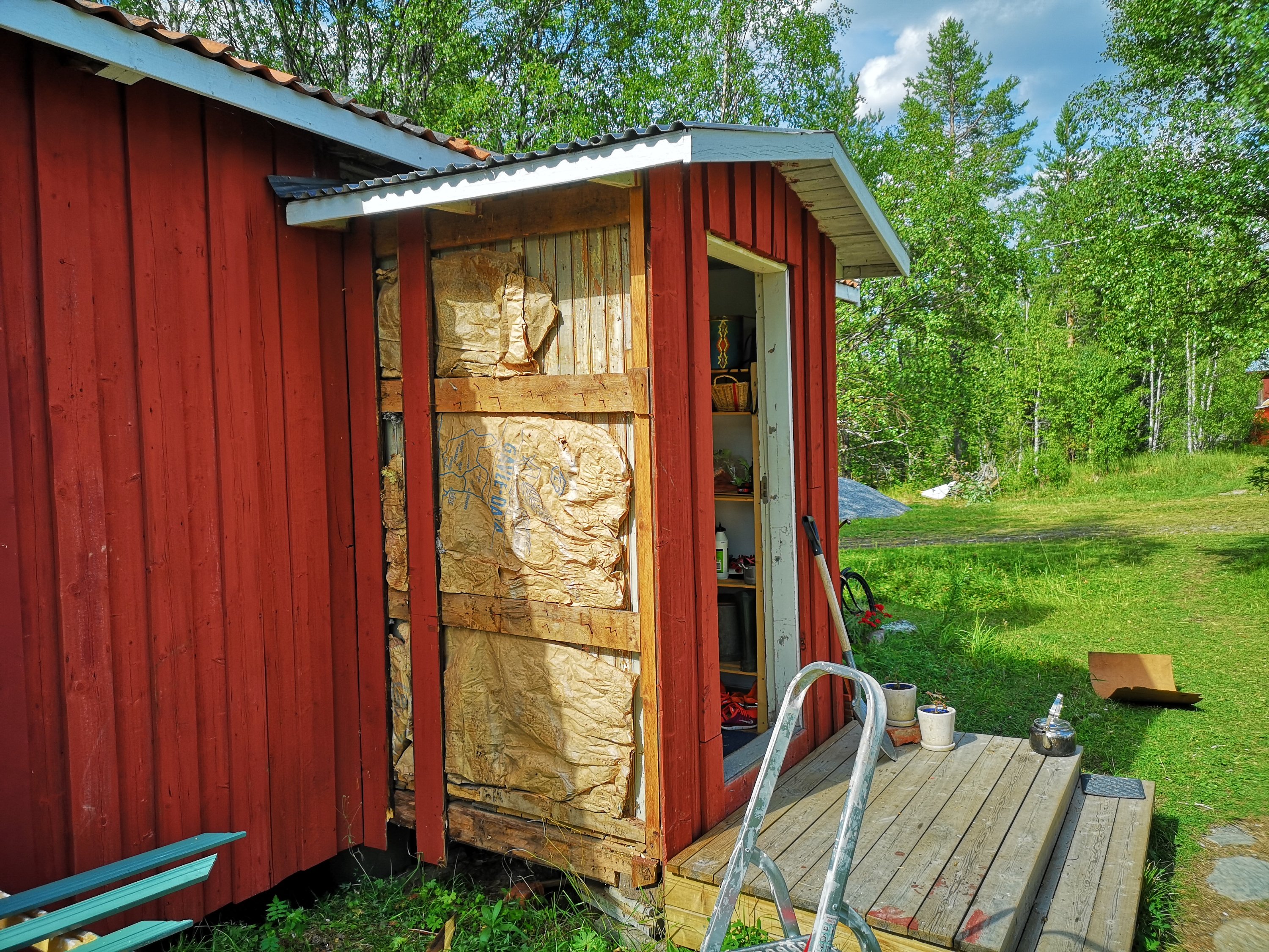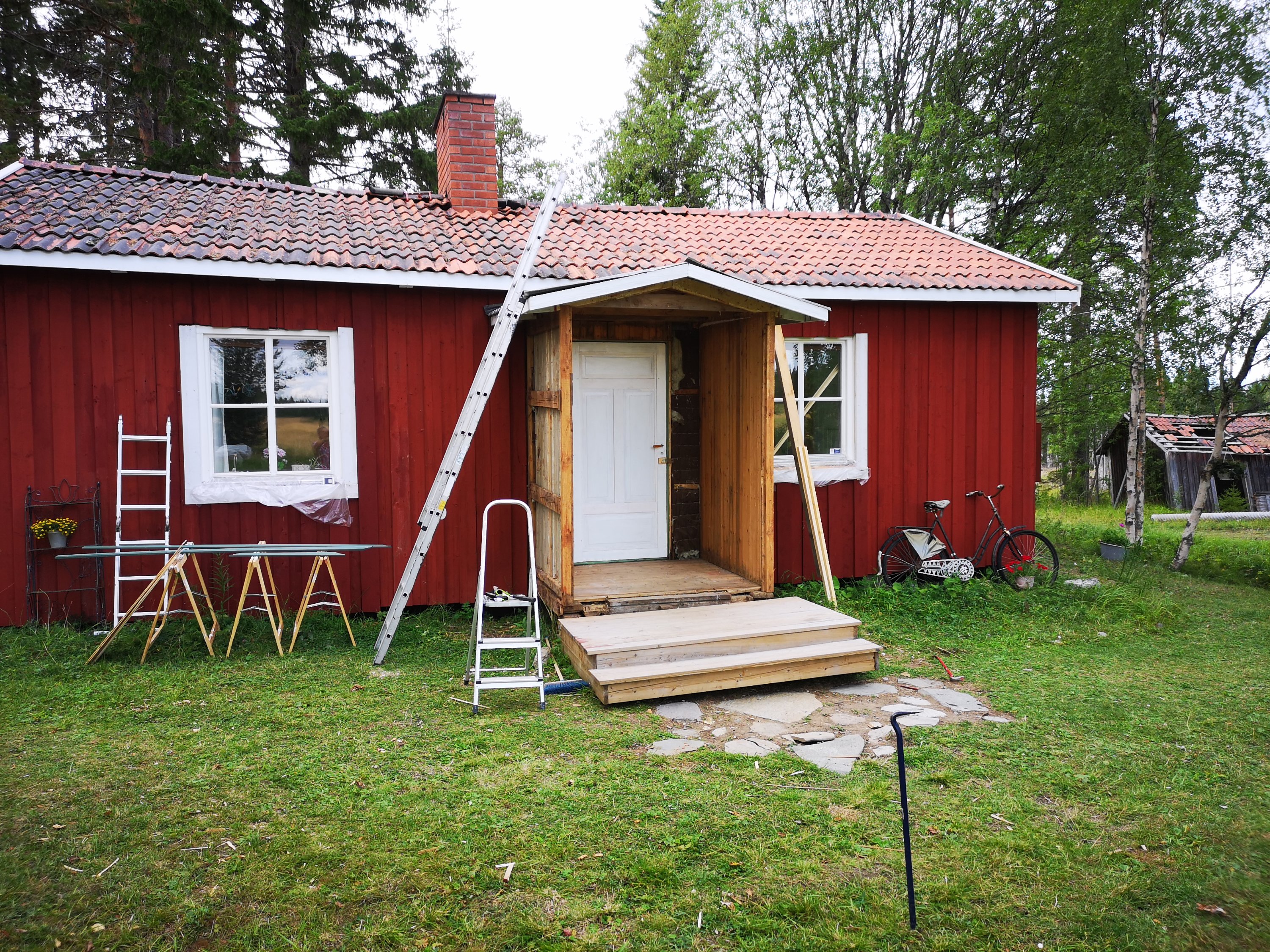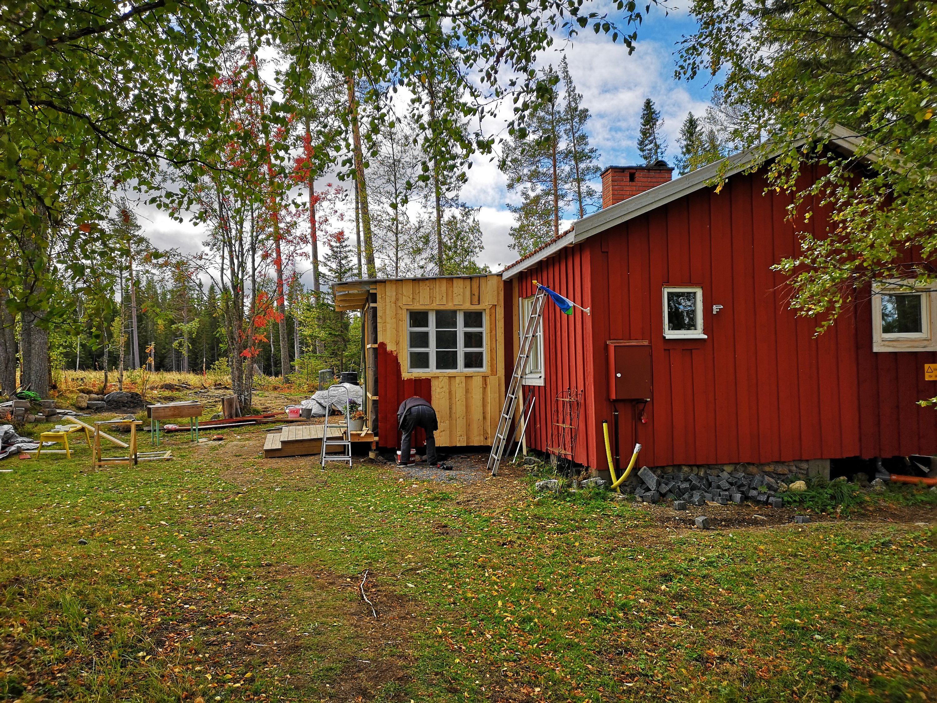 I år har vi byggt ett matrum på ödmjuka 40m2. Det hela startade med att vi tog rätt på ett gammalt bakbord, 110cm x 250cm, och som vi såg framför oss skulle bli ett fantastiskt matbord. Men var? Även om vi numera också har övervåning på stugan, som vi byggde 2018 mest på grund av att stugan behövde ett nytt tak, så fanns inte golvytan för att så stort bord. Drömmen var också att kunna sitta och titta ut över nejden (läs; hygge med vindfällor och ris och med lite älgar och rådjur).