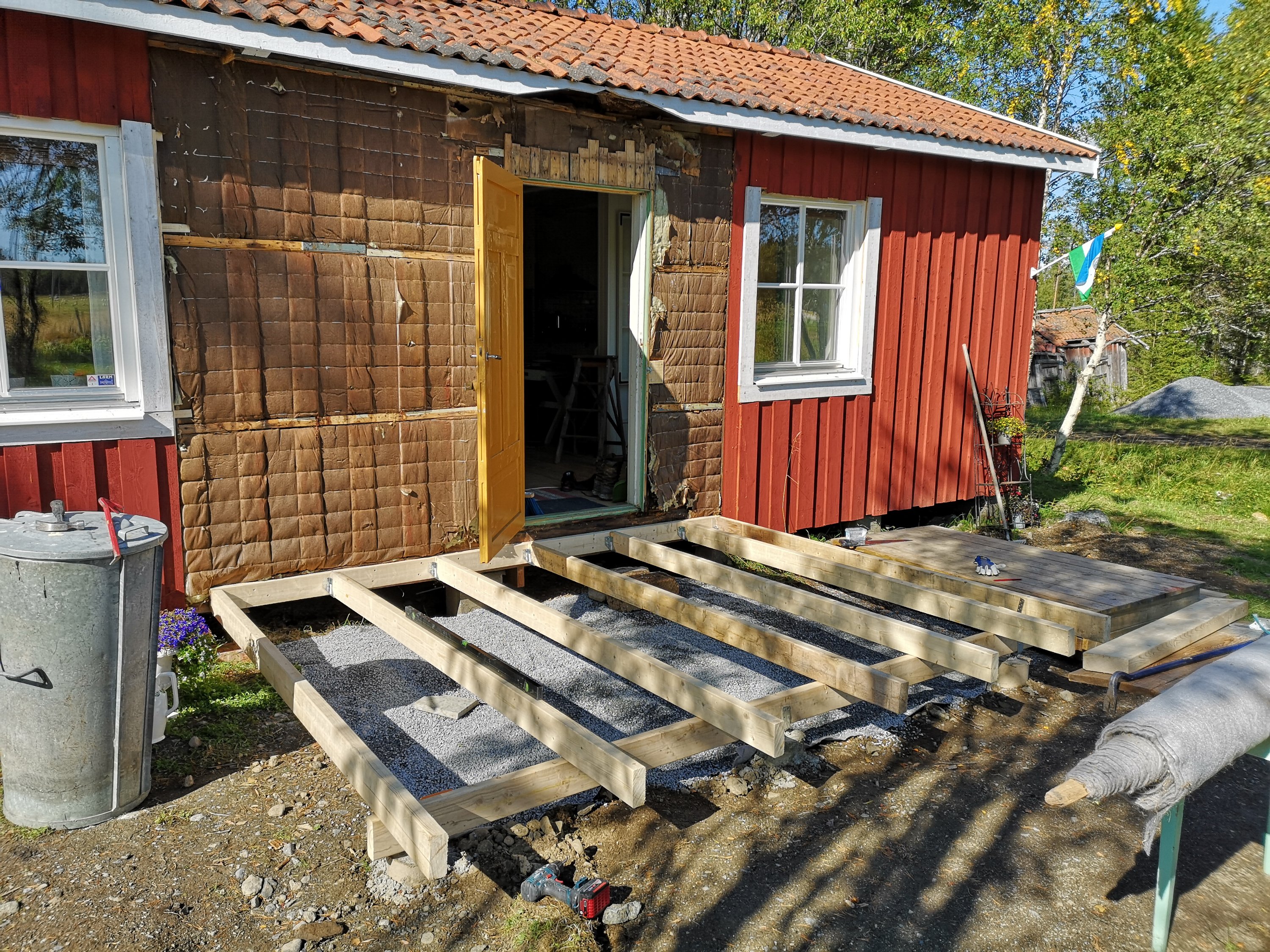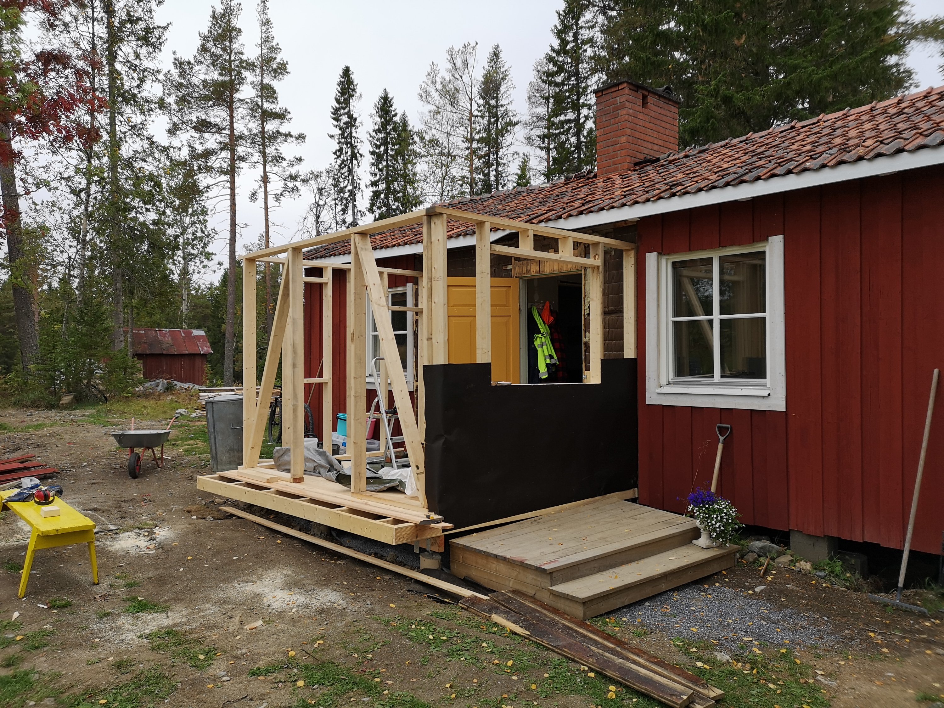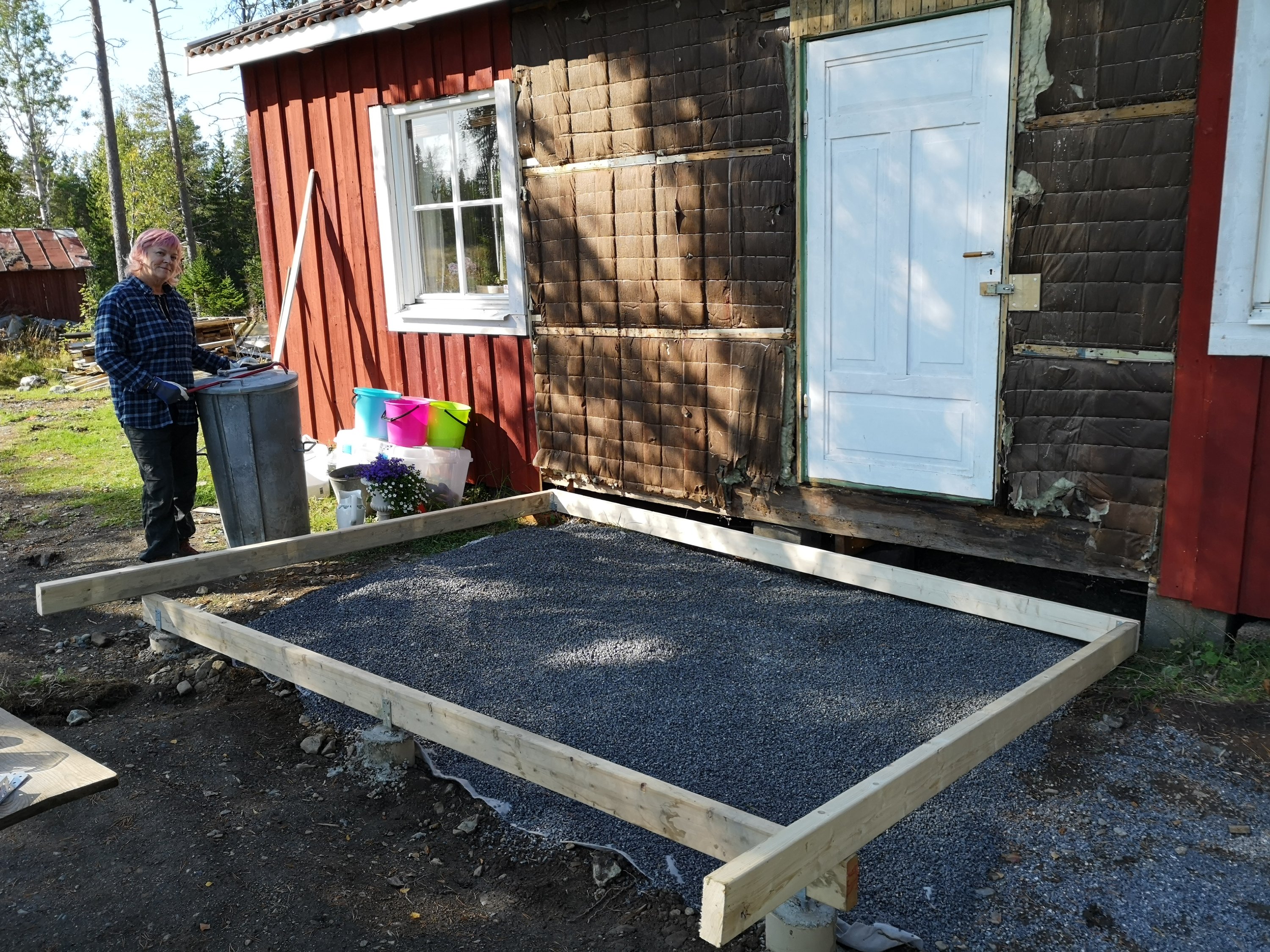 Så vi byggde oss ett matrum. Hur vi haft tid och ork för det är ett litet mysterium för oss. Matz pluggar samtidigt som han jobbar vilket innebar praktik i somras och väldigt lite ledig tid. Men nu är matrummet klart förutom på några detaljer inomhus och en trappa ut mot trädgård/skog. Men vi får berätta mer om själva bygget en annan gång. Det är i alla fall byggt på markskruv, något som vi upplever som otroligt smidigt, snabbt och stabilt. Dessutom billigare och miljövänligare än att gjuta i betong.