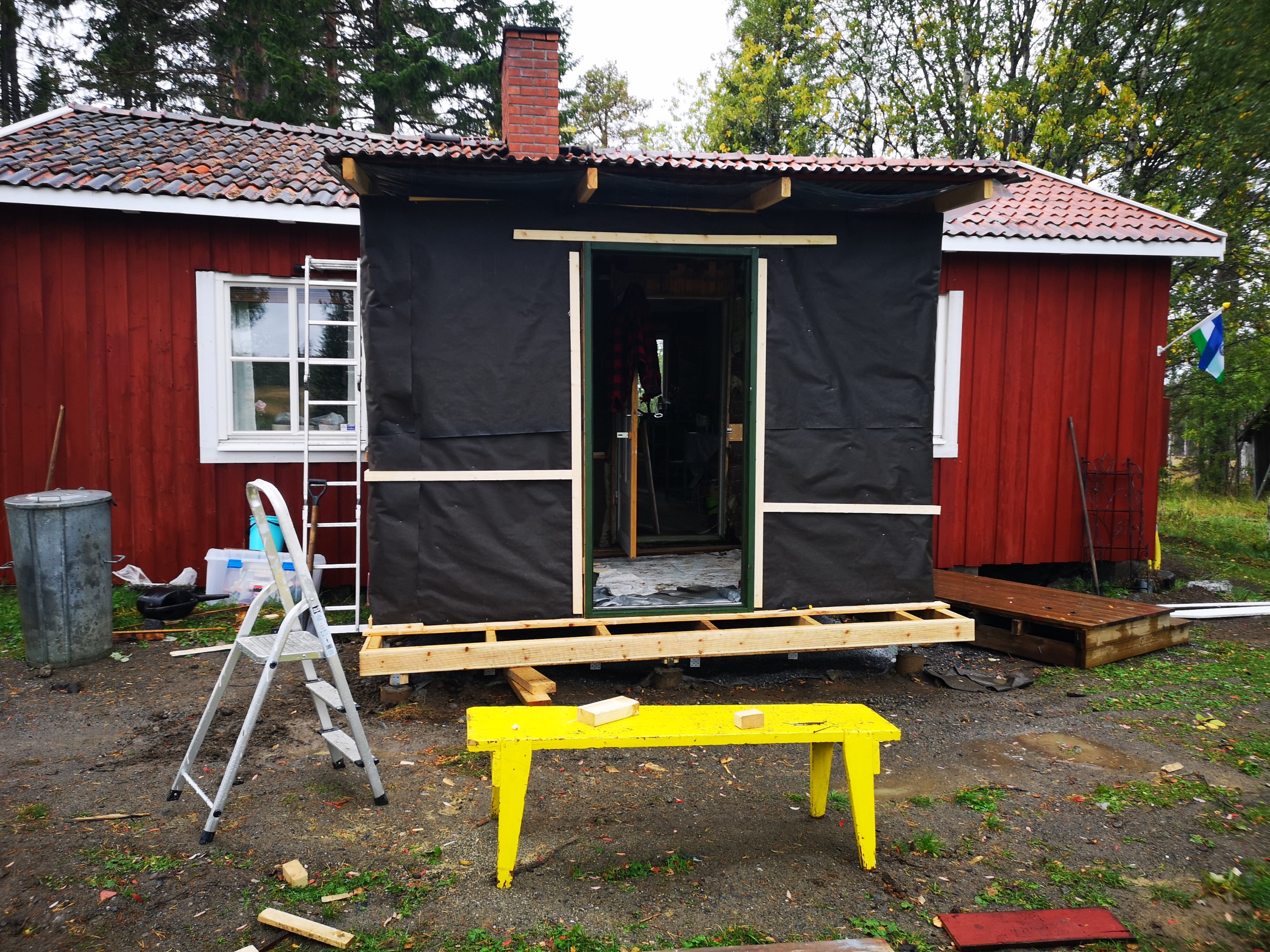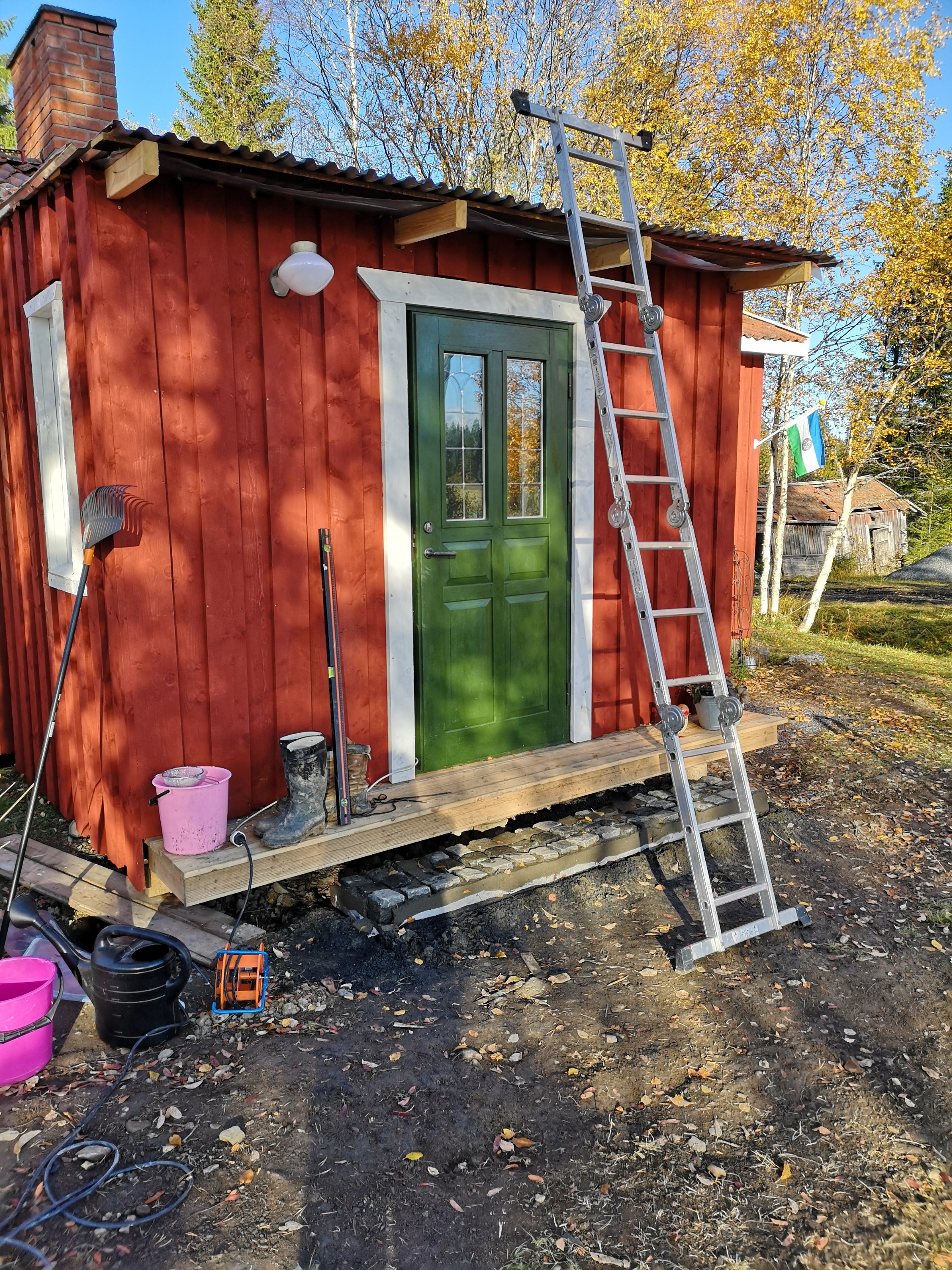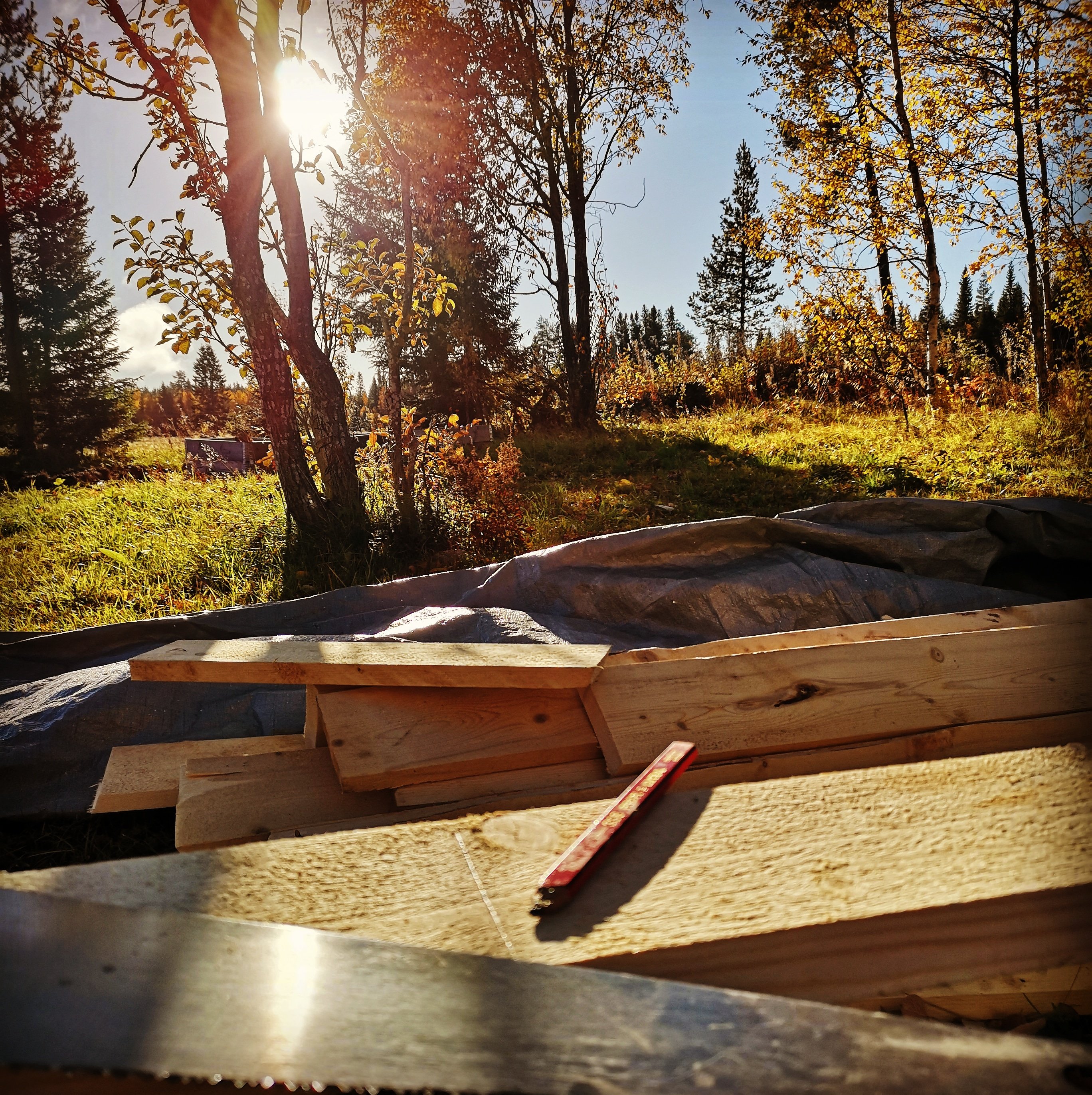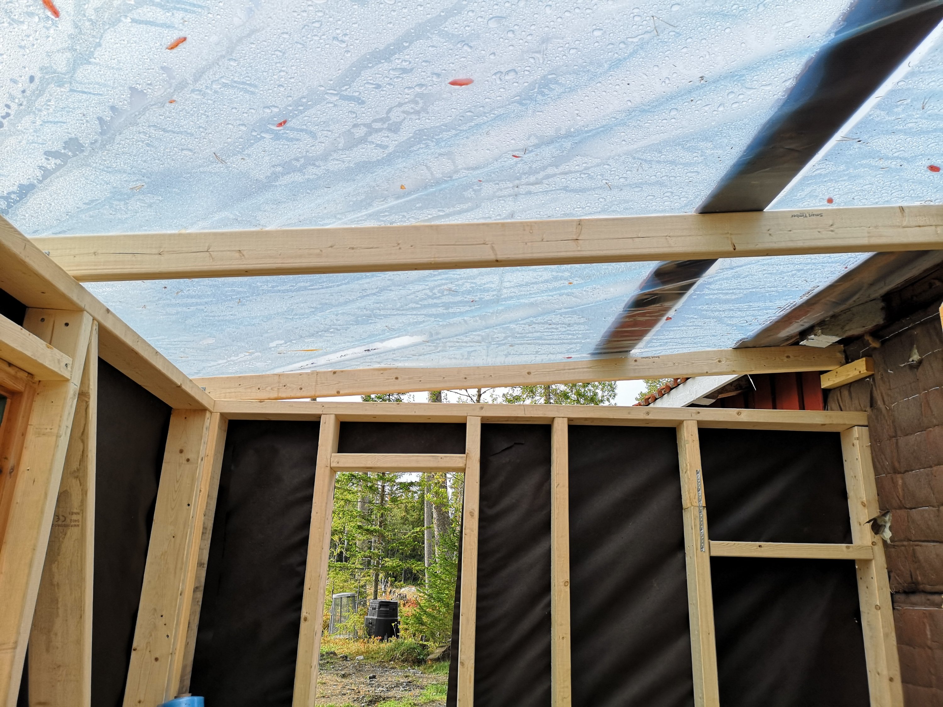 Så vi byggde oss ett matrum. Hur vi haft tid och ork för det är ett litet mysterium för oss. Matz pluggar samtidigt som han jobbar vilket innebar praktik i somras och väldigt lite ledig tid. Men nu är matrummet klart förutom på några detaljer inomhus och en trappa ut mot trädgård/skog. Men vi får berätta mer om själva bygget en annan gång. Det är i alla fall byggt på markskruv, något som vi upplever som otroligt smidigt, snabbt och stabilt. Dessutom billigare och miljövänligare än att gjuta i betong.